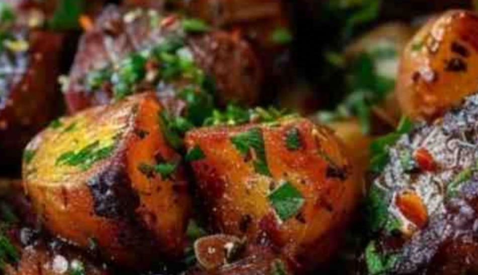 Once the steak bites and potatoes are done, remove them from the air fryer and toss with the garlic butter. Serve hot with optional lemon wedges on the side for a burst of freshness.