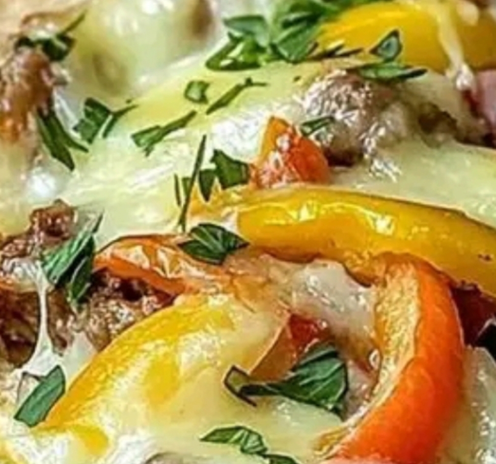 Cheesesteak-Stuffed Garlic Bread is a baked dish featuring a hollowed bread loaf filled with chopped steak, melted cheese, and sautéed vegetables. The stuffed bread is topped with garlic butter and baked until crispy.