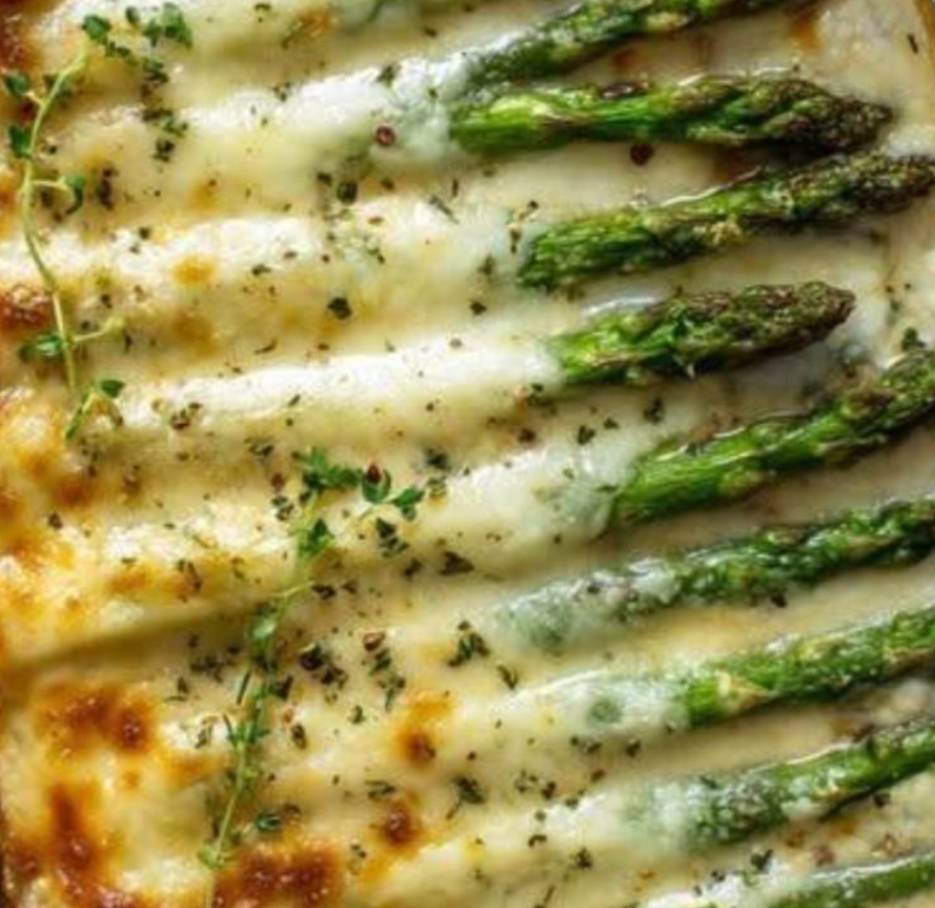Heat the oven to 400 degrees. – Wash and trim the asparagus, then grease a 9 x 13 baking tray and place them in it. In a skillet, melt the butter over medium heat, then add the soft cheese, heavy whipping cream, chicken broth, garlic powder, paprika, Italian seasoning, salt, and pepper. Stirring constantly until ingredients are well blended.