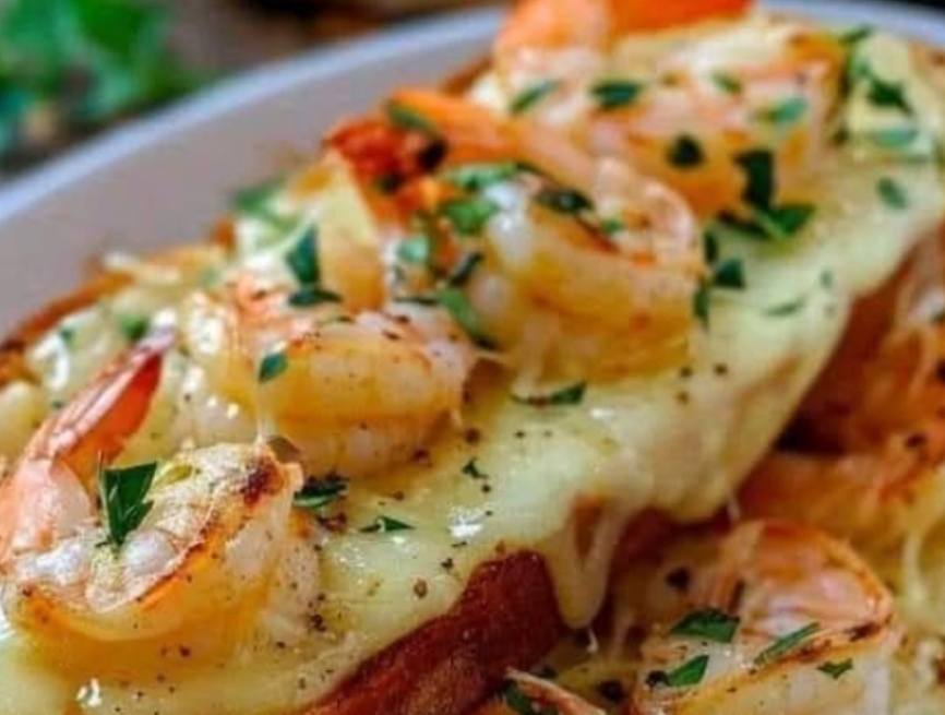 On one half of the garlic bread, layer the cooked shrimp and sprinkle with Monterey Jack cheese.