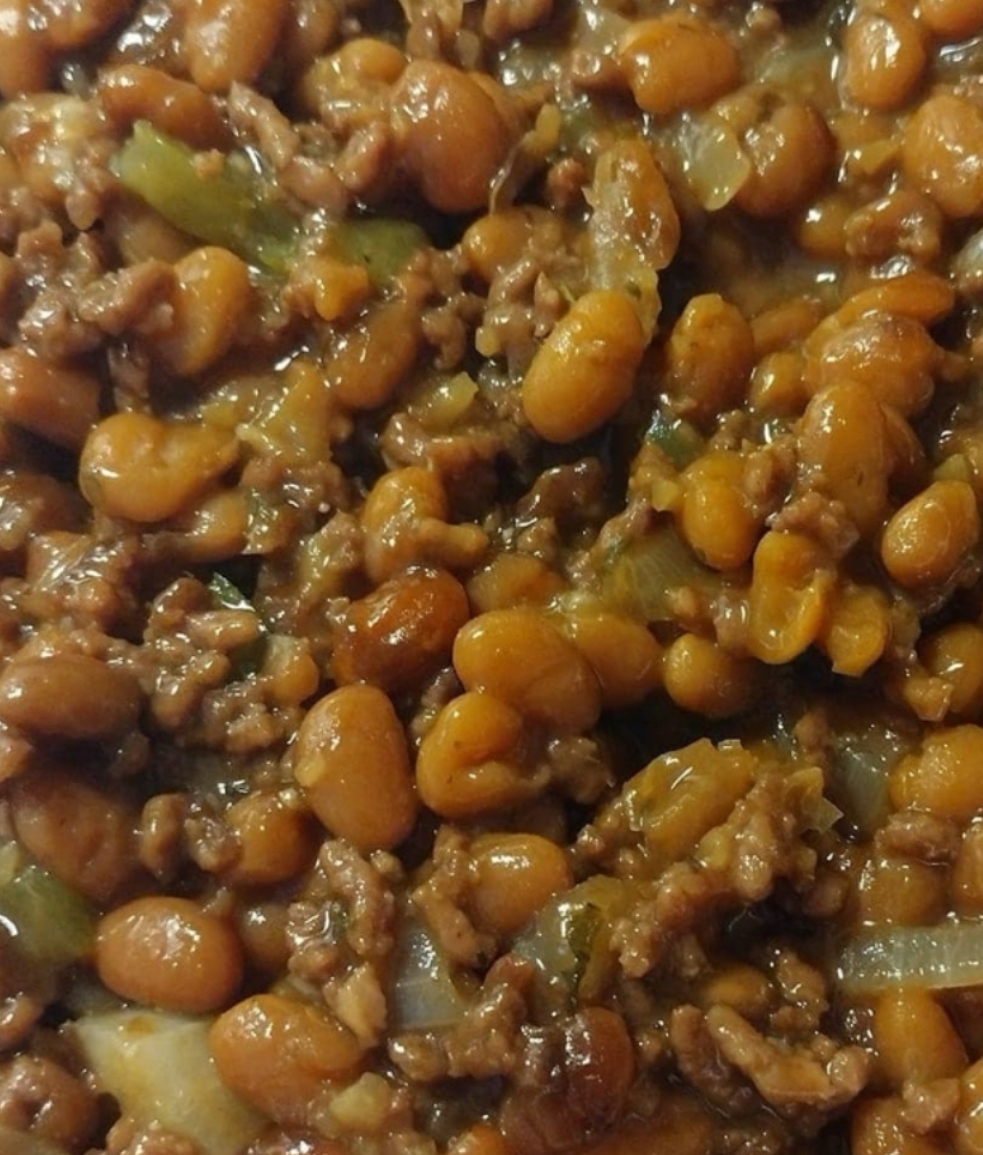 Combine Ingredients: In a large baking dish, mix the cooked beef with the baked beans. Stir in the chopped onions and green bell peppers, distributing them evenly.