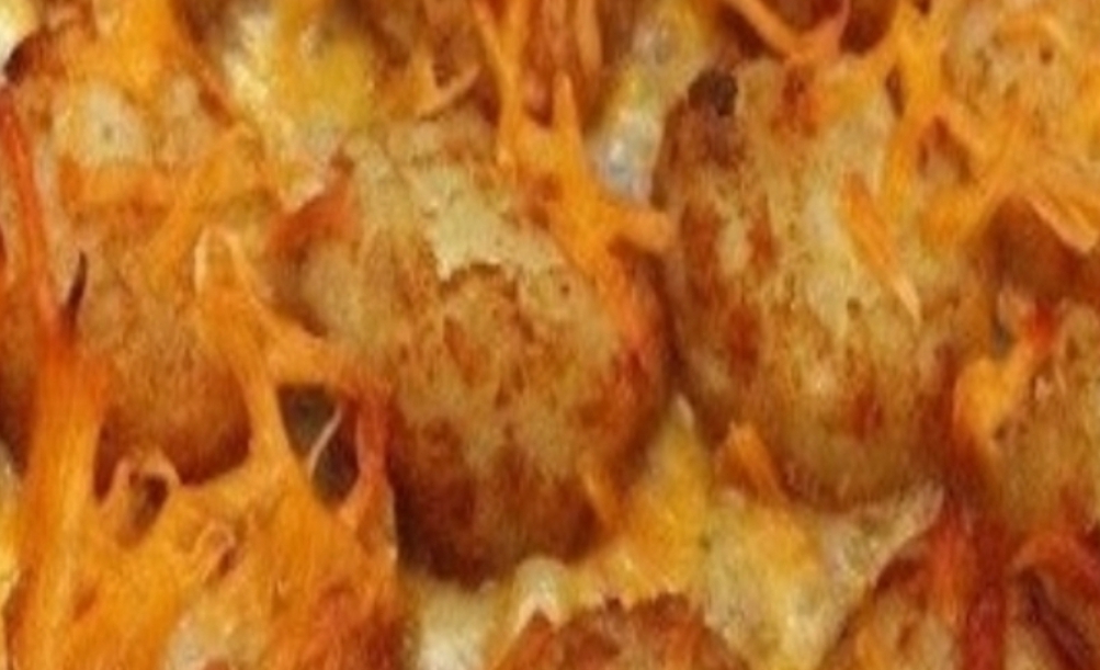 - Spread the meat mixture over the layer of tater tots.
