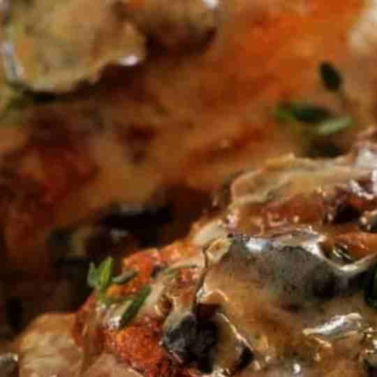 Step 1: Season and Sear the ChickenPat the chicken thighs dry with paper towels and season both sides with salt and pepper.In a large skillet over medium-high heat, heat the olive oil. Add the chicken thighs, skin side down, and cook for about 5-7 minutes until the skin is crispy and golden brown. Flip the chicken and cook for another 5 minutes. Remove the chicken from the skillet and set aside.Step 2: Sauté the VegetablesIn the same skillet, melt the butter. Add the chopped onion and cook until softened, about 3-4 minutes.Add the minced garlic and sliced mushrooms, and cook until the mushrooms are browned and any liquid has evaporated, about 5-7 minutes.Step 3: Make the SaucePour in the chicken broth, scraping up any browned bits from the bottom of the skillet.Stir in the heavy cream, Dijon mustard, and thyme leaves. Bring to a simmer.Step 4: Cook the Chicken in the SauceReturn the seared chicken thighs to the skillet, skin side up. Reduce the heat to medium-low, cover the skillet, and simmer for about 25-30 minutes, or until the chicken is cooked through and tender.Step 5: Finish the SauceRemove the lid and stir in the grated Parmesan cheese. Simmer uncovered for an additional 5 minutes to thicken the sauce slightly. Taste and adjust the seasoning with more salt and pepper if needed.Step 6: ServeGarnish the creamy mushroom chicken with fresh thyme or parsley.Serve hot over rice, mashed potatoes, or pasta.Enjoy your creamy mushroom chicken, a perfect blend of savory flavors and creamy texture!