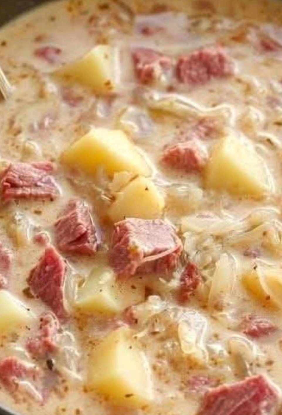 Creamy Reuben Soup is a savory soup that translates the core flavors of a Reuben sandwich into a liquid form. The recipe typically features a base of beef broth and cream, incorporating corned beef, sauerkraut, Swiss cheese, and Russian or Thousand Island dressing flavors. It is a cooked soup that is simmered and thickened before serving.