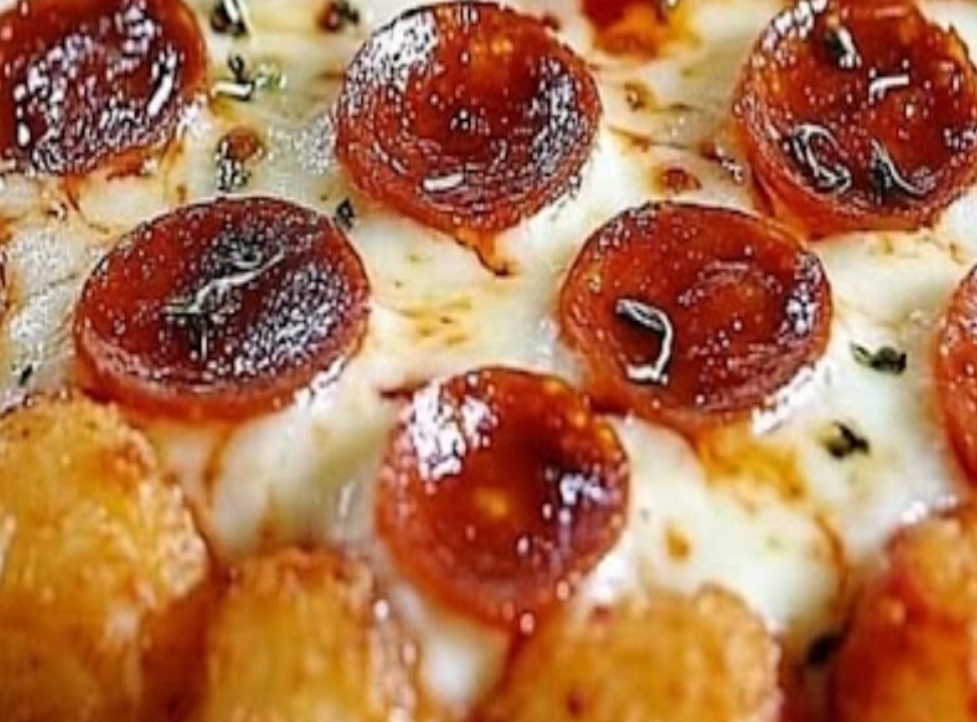 Remove the crust from the oven and spread the pizza sauce evenly over the tater tots.