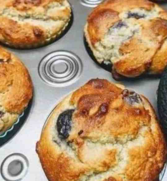 3. Add almond flour and baking powder and mix. Carefully fold in the blueberries. Divide batter into 10. Bake for 25 minutes.
