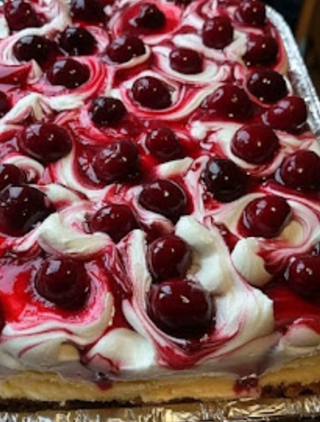 Spread ⅔ of the cherry pie filling evenly over the cake layer.