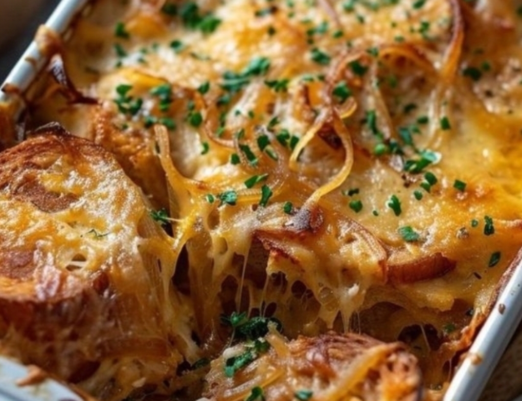 This isn’t just another casserole—it’s elevated comfort food. Inspired by the beloved French onion soup, this version transforms tender sweet onions, wine, and broth into a thick, flavorful base, then builds it up with crunchy toasted bread and a blanket of Gruyère and Parmesan. Baked until golden and bubbly, every bite delivers savory depth, cheesy richness, and that irresistible crisp-tender texture.