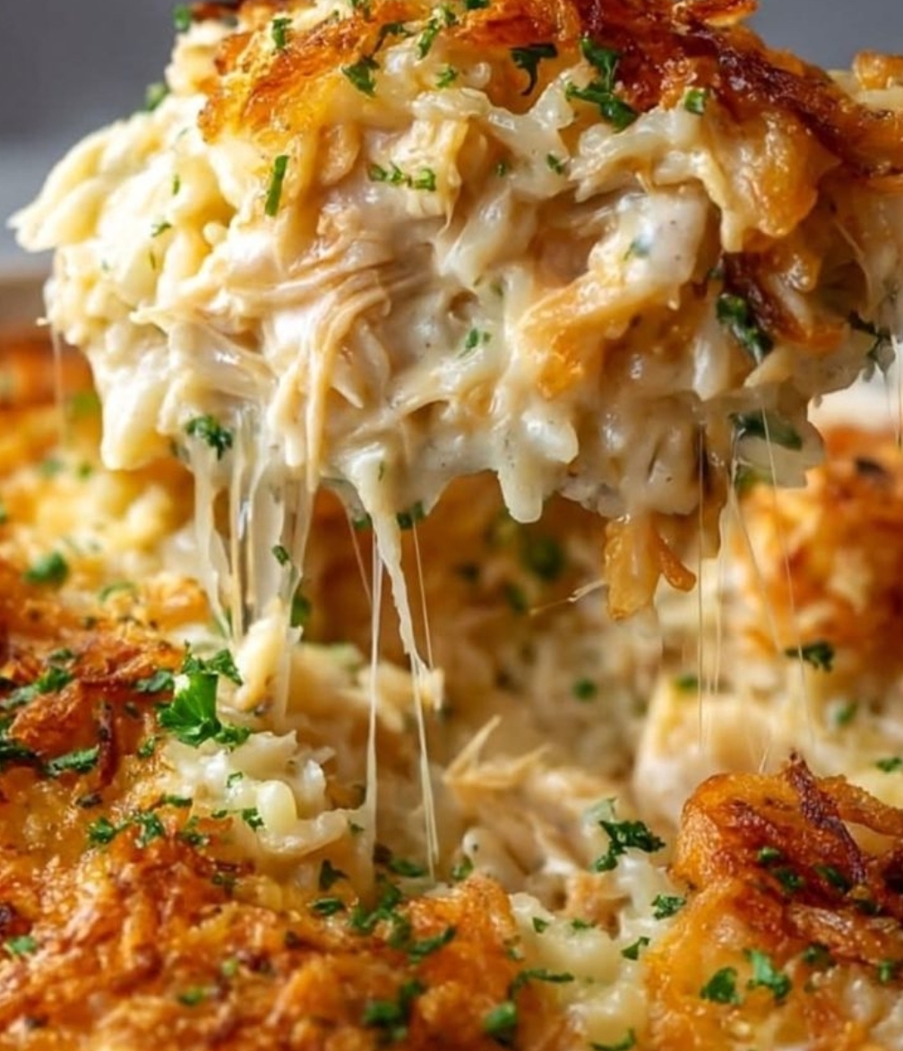 Creamy, cheesy, and loaded with French onion flavor—this easy chicken rice casserole is a cozy dinner winner every time!