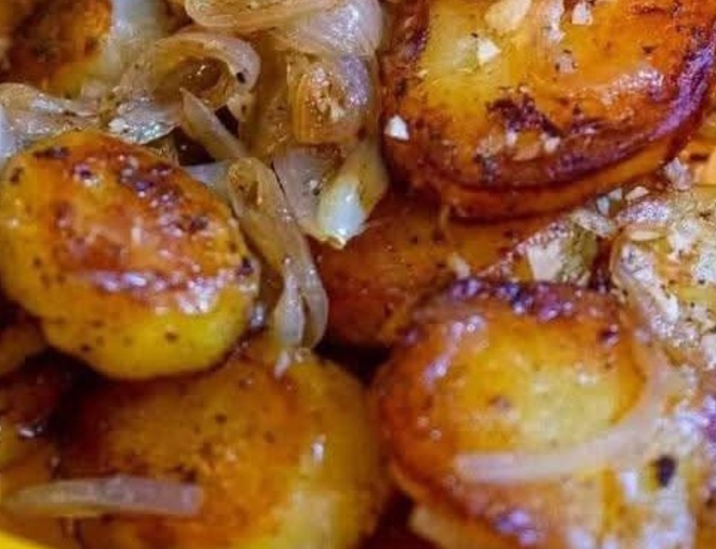 Once the potatoes are crispy and golden, add the caramelized onions back into the pan. Toss them together gently to combine the flavors. - Garnish: