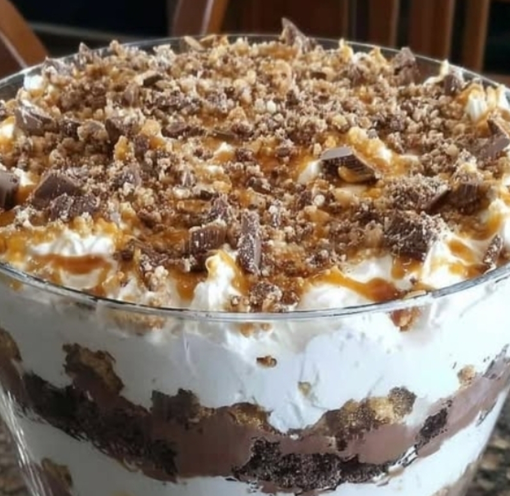 In a large trifle bowl or glass serving dish, start with half of the brownie chunks, followed by half of the pudding, then half of the whipped topping, and sprinkle with half of the crushed candy bars. - Repeat: