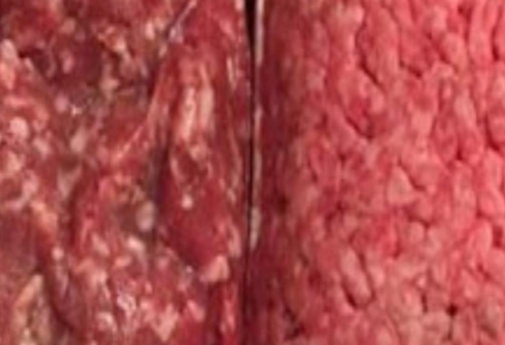 The darker color of the beef on the left suggests it hasn’t been exposed to as much oxygen or preservatives, and it may have a higher fat content, often indicating fresher, less processed meat. The beef on the right, though brighter in color, is not necessarily fresher. In fact, that bright pink hue is often due to carbon monoxide packaging or other gas treatments used to keep the meat looking fresh longer. And if you look closely at the bottom of the right package, there’s a grayish-brown spot—likely a sign of oxidation, which happens when meat is aging or hasn’t been stored properly.