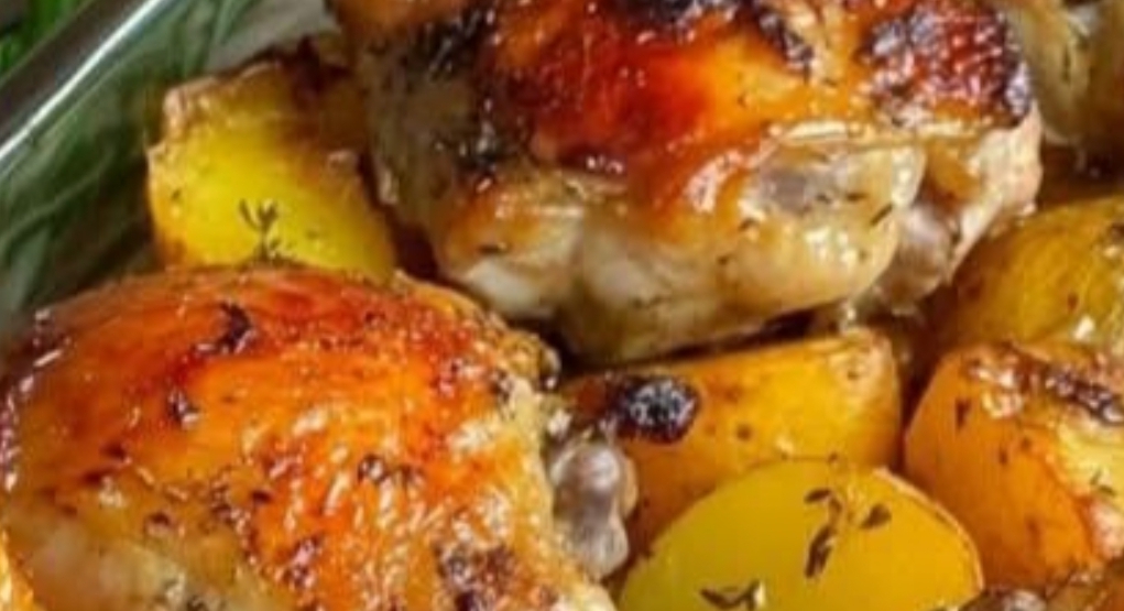 Bake in the oven for 45–55 minutes, or until the chicken is fully cooked (internal temp 75°C/165°F) and the skin is golden brown. Potatoes should be tender and slightly crispy.