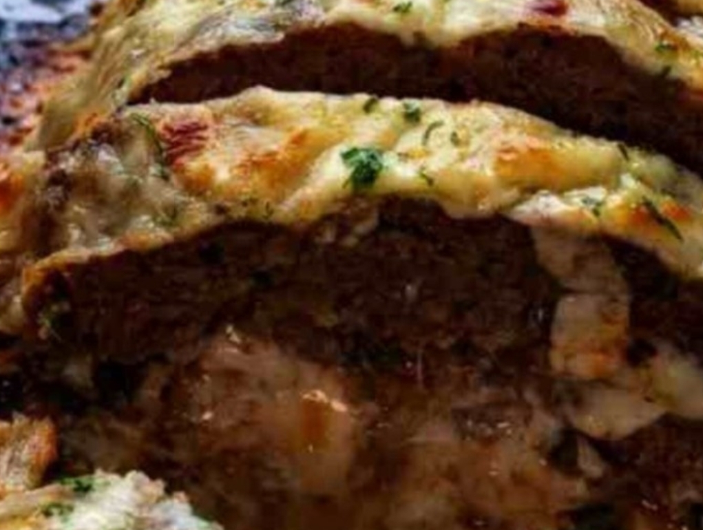 4. Slice the meatloaf into portions and serve warm. The melted cheese and savory flavors make it a perfect dish on its own, but you can also serve it with additional sautéed mushrooms, onions, and peppers if desired.