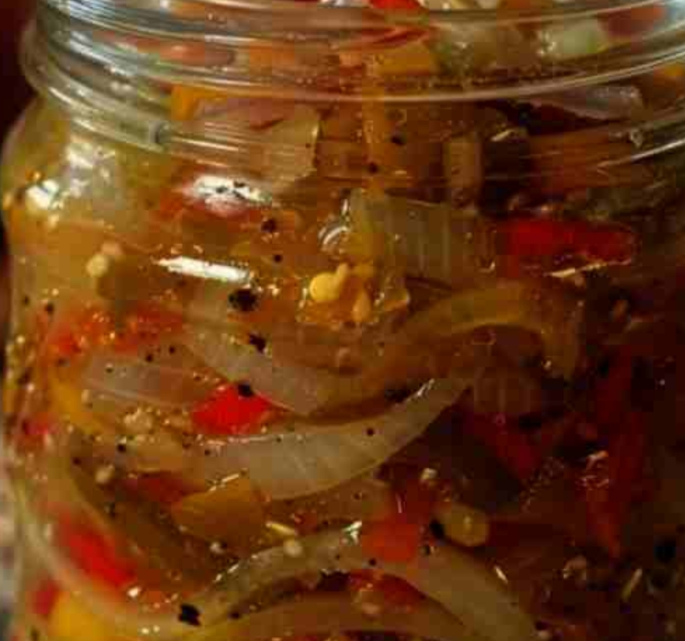 Pour the hot vinegar mixture over the sliced peppers and onions. Stir well to combine.