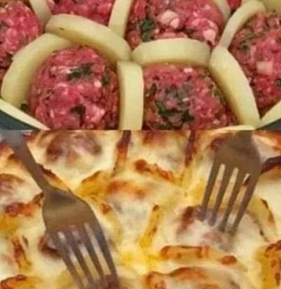 Use the remaining potato slices to separate the meatballs and form small portions.