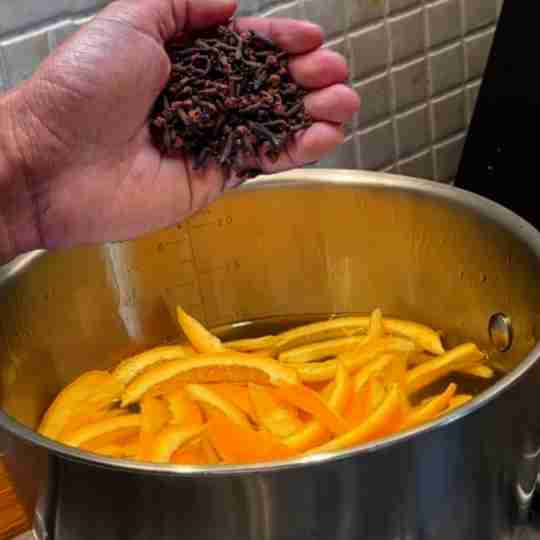 Carefully add the cleaned orange peels and cloves to the boiling water, then immediately lower the heat to a simmer.
