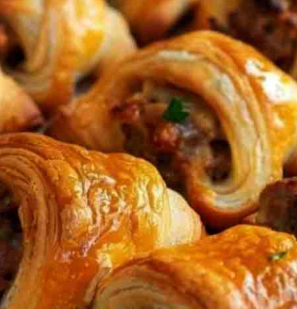 , and shredded cheddar cheese. Mix until well combined.3.Prepare the Puff Pastry:•Preheat your oven to 375°F (190°C).•Roll out the puff pastry sheets on a lightly floured surface. Cut each sheet into 6–8 squares, depending on your desired size.4.Assemble the Pastries:•Place a spoonful of the sausage mixture in the center of each puff pastry square.•Fold the pastry over the filling, either into a triangle or roll it into a crescent shape. Seal the edges by pressing them together or crimping with a fork.5.Add Egg Wash:•Place the stuffed pastries on a parchment-lined baking sheet.•Brush the tops with beaten egg to give them a golden, shiny finish.6.Bake:•Bake in the preheated oven for 15–20 minutes, or until the puff pastry is golden and flaky.7.Garnish and Serve:•Optional: Sprinkle with chopped parsley or chives for a fresh touch.•Serve warm as a snack, appetizer, or party dish.Enjoy these crispy, cheesy sausage-stuffed pastries! Let me know if you need more tips.Enjoy!