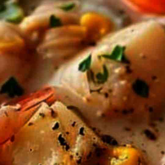 In a large pot, melt the butter over medium heat. Add the diced onion and cook until translucent, about 5 minutes.Stir in the Old Bay seasoning and thyme. Sprinkle in the flour and cook for 1-2 minutes to form a roux.Add the celery, carrot, potatoes, and corn to the pot. Pour in the seafood or chicken broth and white grape juice, stirring well to combine.Bring the mixture to a boil, then reduce the heat and let it simmer for 15-20 minutes, or until the vegetables are tender.Add the white fish, scallops, shrimp, and clams to the pot. Simmer for another 5-7 minutes, or until the seafood is cooked through.Stir in the heavy cream and let the chowder simmer for an additional 5 minutes, allowing the flavors to meld together.Season with salt and pepper to taste. Garnish with chopped parsley before serving.