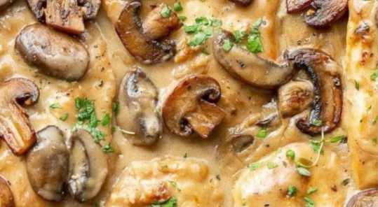 Pour the cream over the mushrooms and simmer for a few minutes, the sauce should reduce. To finish, put the chicken back (this is the last time!!) in the pan, coat it with the sauce and let it heat up for a few minutes.