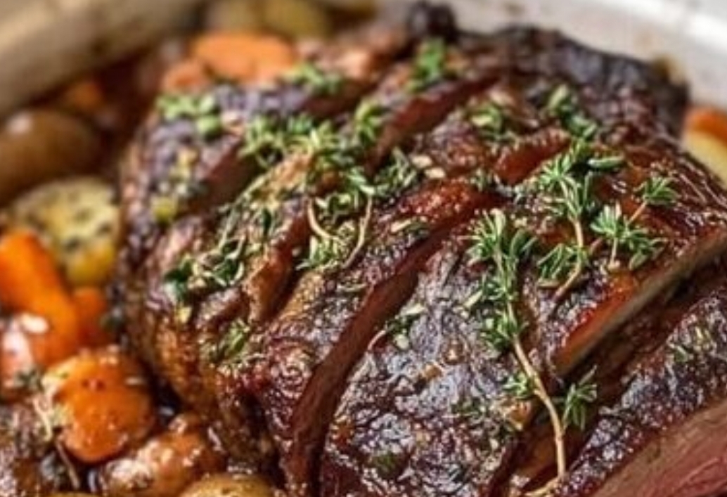 - Whisk beef broth, wine, tomato paste, Worcestershire, thyme, rosemary, and bay leaves. Pour around roast.