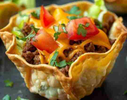 Spoon the cooked taco meat into each tortilla or wonton wrapper cup.