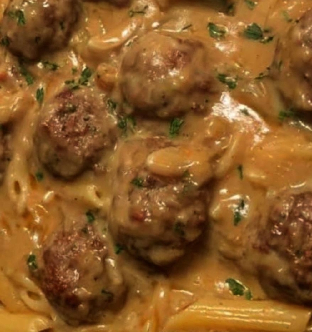Assemble the Casserole: Spread the cooked noodles evenly in the prepared baking dish. Nestle the meatballs among the noodles. Pour the sauce evenly over the dish. Sprinkle grated Swiss cheese over the top.