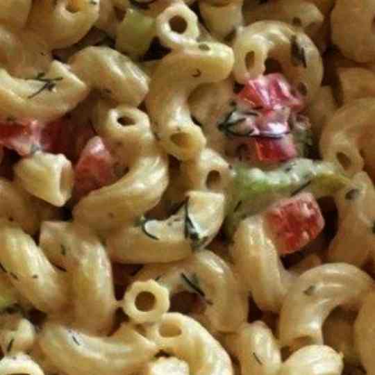 Cook macaroni to al dente according to package directions, drain and rinse. Transfer to large bowl, let cool.