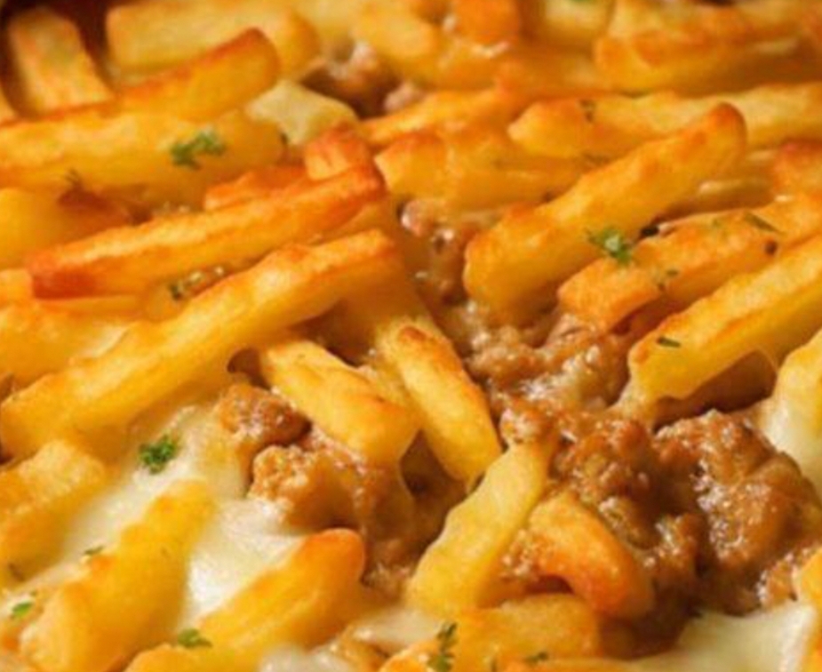 Place the casserole in the preheated oven and bake for about 35-40 minutes or until the French fries are golden brown and the filling is bubbling.