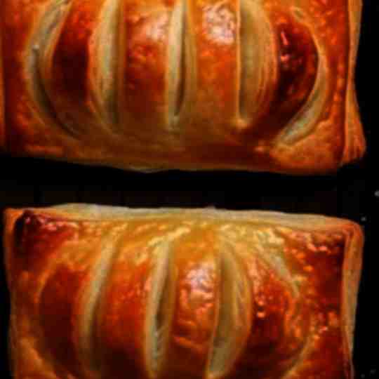 Assemble: Dampen the edges of one pastry rectangle, place a portion of the cooled apple mixture on top, then cover with another pastry rectangle, this time with slits cut into it. Press the edges together to seal. Repeat this process to create six apple parcels.